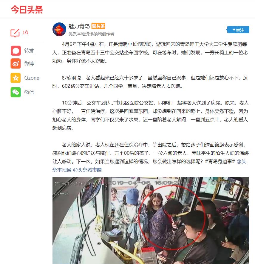 老人的家人说,老人现在还在住院治疗中,等出院之后,想给孩子们送面锦旗表示感谢,感谢他们暖心的护送与陪伴。五个00后的孩子,一位六旬的老人,素昧平生的陌生人间的温暖让人感动。下一次,如果当您遇到这样的情况,您会做出怎样的选择呢?#青岛身边事# @头条本地通 @头条城市圈