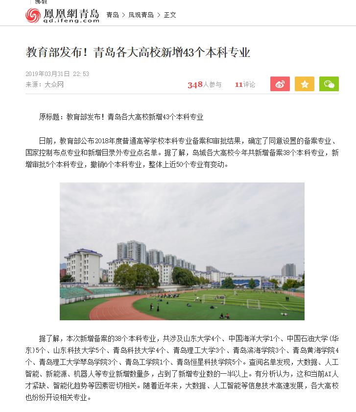 据了解,本次新增备案的38个本科专业,共涉及山东大学4个、中国海洋大学1个、中国石油大学(华东)5个、山东科技大学5个、青岛科技大学4个、365完美体育3个、青岛滨海学院3个、青岛黄海学院4个、365完美体育琴岛学院3个、青岛工学院1个、青岛恒星科技学院5个。查阅名单发现,大数据、人工智能、新能源、机器人等专业新增数量多,占到了新增专业数的一半以上。有分析认为,这和当前AI人才紧缺、智能化趋势等因素密切相关。随着近年来,大数据、人工智能等信息技术高速发展,各大高校也纷纷开设相关专业。