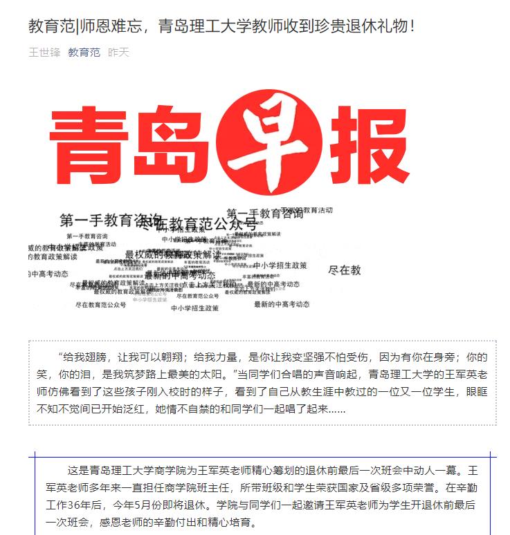 班会中,辅导员和两个班级的学生无一缺席,他们为王军英老师准备好班级活动纪念册,精心制作了感恩视频,为王军英老师合唱了歌曲《最美的太阳》。突然的惊喜和温暖的现场使王军英老师心情激动,同学们的齐声表白和王军英老师“同学们,我也爱你们”的回应,感动了现场每一个人。王军英表示十分感谢学院和同学们为她专门组织的退休前最后一次班会,今天将成为她的美好回忆,同学们对她的爱是她收到的最珍贵的退休礼物。