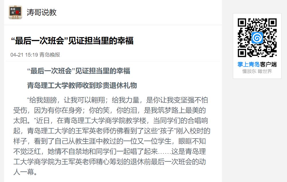 记者了解到,王军英多年来一直担任商学院班主任,所带班级和学生荣获国家及省级多项荣誉。在辛勤耕耘36年后,今年5月份即将退休。学院与同学们一起邀请王军英老师为学生开退休前的最后一次班会,感恩老师的辛勤付出和精心培育。