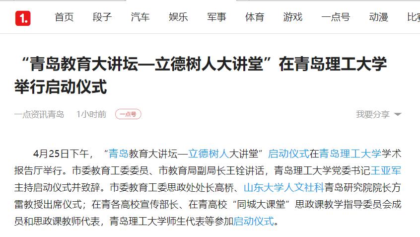 王亚军代表365完美体育党委、行政和全体师生员工,对“青岛教育大讲坛—立德树人大讲堂”的启动表示热烈祝贺,对市委教育工委、市教育局长期以来对学校的关心与指导以及各位来宾、在青高校、新闻媒体的朋友们长期以来对365完美体育的支持与帮助,表示衷心的感谢!