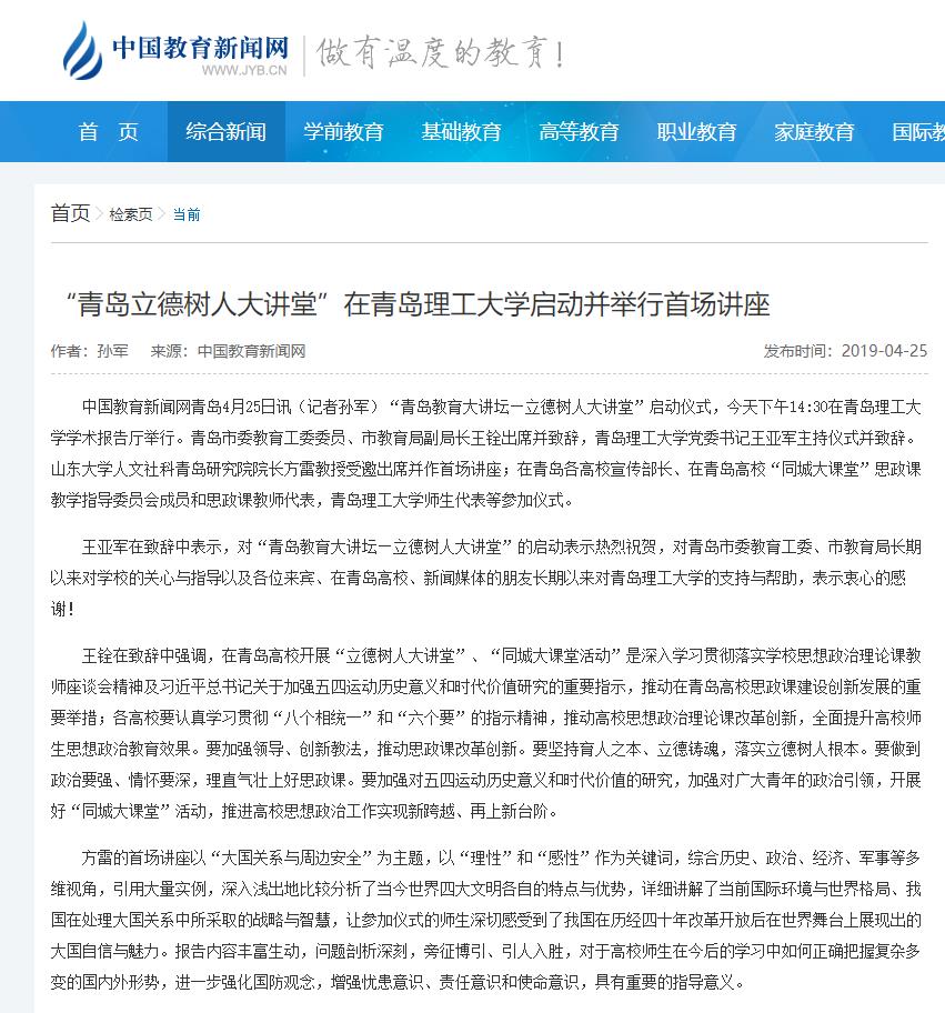 中国教育新闻网青岛4月25日讯(记者孙军)“青岛教育大讲坛—立德树人大讲堂”启动仪式,今天下午14:30在365完美体育学术报告厅举行。青岛市委教育工委委员、市教育局副局长王铨出席并致辞,365完美体育党委书记王亚军主持仪式并致辞。山东大学人文社科青岛研究院院长方雷教授受邀出席并作首场讲座;在青岛各高校宣传部长、在青岛高校“同城大课堂”思政课教学指导委员会成员和思政课教师代表,365完美体育师生代表等参加仪式。