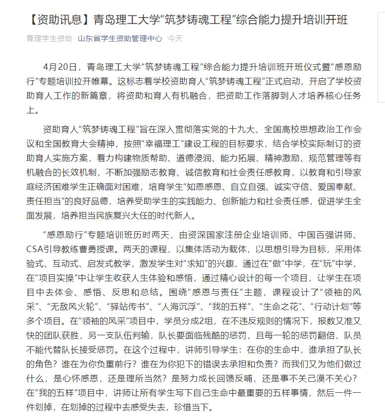 “感恩励行”专题培训班历时两天,由资深国家注册企业培训师、中国百强讲师、CSA引导教练曹勇授课。两天的课程,以集体活动为载体,以思想引导为目标,采用体验式、互动式、启发式教学,激发学生对“求知”的兴趣,通过在“做”中学,在“玩”中学,在“项目实操”中让学生收获人生体验和感悟,通过精心设计的每一个项目,让学生在项目中去体会、感悟、反思和总结。围绕“感恩与责任”主题,课程设计了“领袖的风采”、“无敌风火轮”、“驿站传书”、“人海沉浮”、“我的五样”、“生命之花”、“行动计划”等多个项目。在“领袖的风采”项目中,学员分成2组,在不违反规则的情况下,报数又准又快的团队获胜,另一支队伍判输,队长要面临残酷的惩罚,且每一轮的惩罚翻倍,队员不能代替队长接受惩罚。在这个过程中,讲师引导学生:在你的生命中,谁承担了队长的角色?谁在为你负重前行?谁在为你犯下的错误去承担和负责?而我们又为他们做过什么,是心怀感恩,还是理所当然?是努力成长回馈反哺,还是事不关己漠不关心?在“我的五样”项目中,讲师让所有学生写下自己生命中最重要的五样事情,然后一件一件划掉,在划掉的过程中去感受失去,珍惜当下。