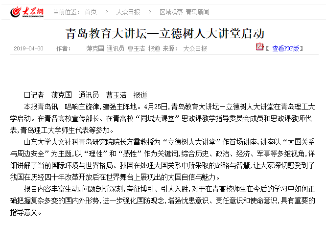 山东大学人文社科青岛研究院院长方雷教授为“立德树人大讲堂”作首场讲座,讲座以“大国关系与周边安全”为主题,以“理性”和“感性”作为关键词,综合历史、政治、经济、军事等多维视角,详细讲解了当前国际环境与世界格局、我国在处理大国关系中所采取的战略与智慧,让大家深切感受到了我国在历经四十年改革开放后在世界舞台上展现出的大国自信与魅力。
