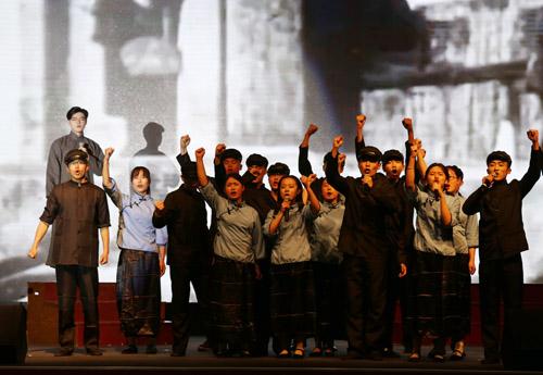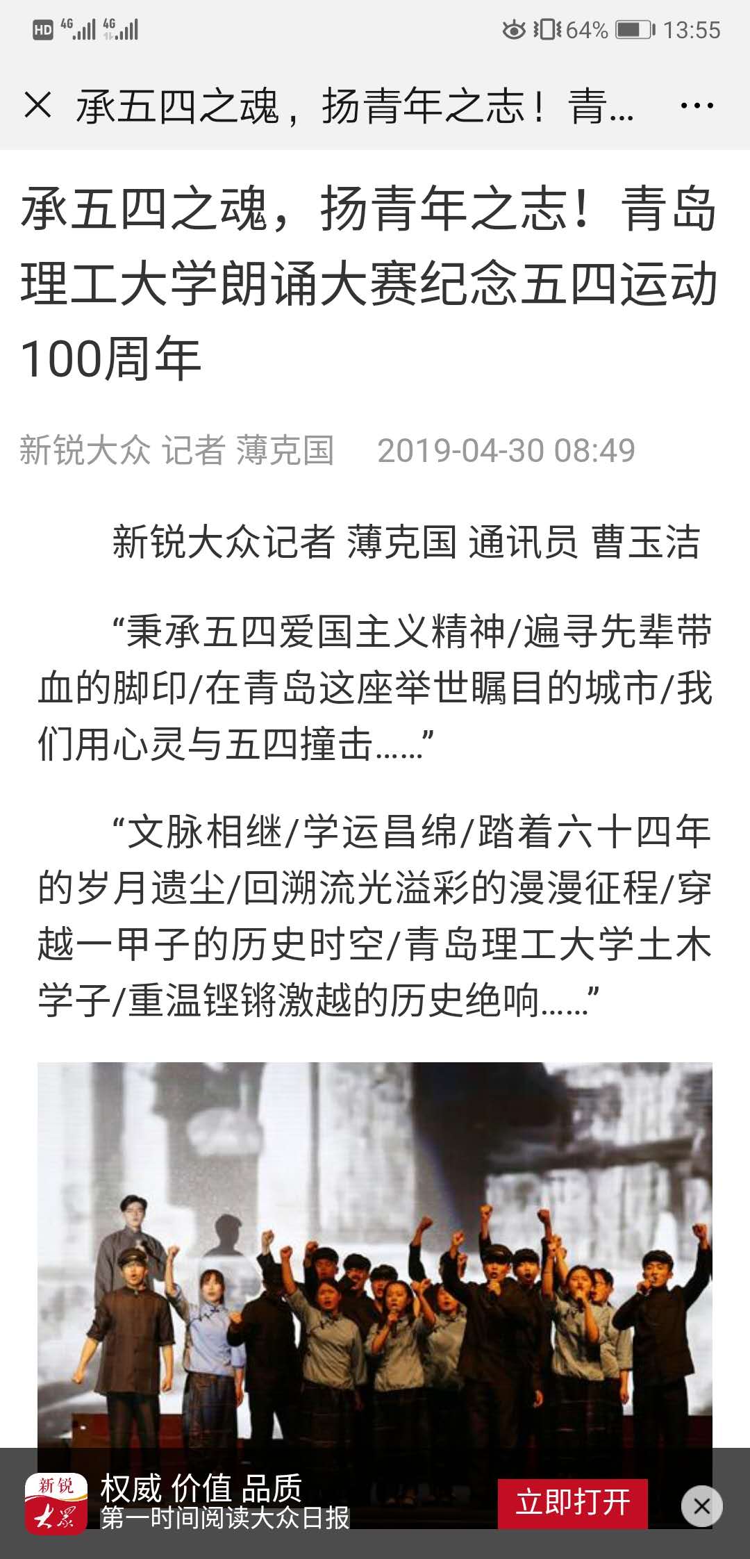 “秉承五四爱国主义精神/遍寻先辈带血的脚印/在青岛这座举世瞩目的城市/我们用心灵与五四撞击……”