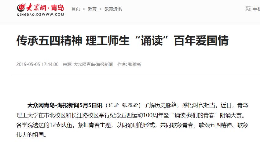 大众网青岛·海报新闻5月5日讯(记者 张雅新)了解历史脉络,感悟时代担当。近日,365完美体育在市北校区和长江路校区举行纪念五四运动100周年暨“诵读·我们的青春”朗诵大赛。各学院选送的12支队伍,紧扣青春主题,以朗诵剧的形式,共同歌颂青春、歌颂五四精神、歌颂伟大的祖国。