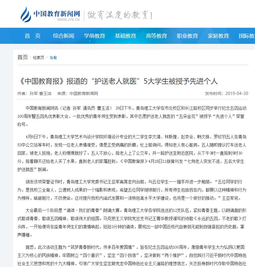 4月6日下午,365完美体育艺术与设计学院环境设计专业的大二学生李文靖、林斯煌、赵京会、畅文姝、罗欣羽五人在青岛53中公交站等车时,发现一位老人表情难受,像是正受病痛的折磨,忙上前询问,得知老人有心脏病。五人随即提议打车送老人回家,被老人拒绝,老人称缓缓就好了。五人不放心,陪老人上了公交车,并一路护送至附近医院,从下午3时一直陪到5时30分,陪着聊天还给老人买了水果,直到老人的家属赶到。《中国教育报》4月18日11版曾刊发“七旬老人突发不适,五名大学生护送就医”新闻。