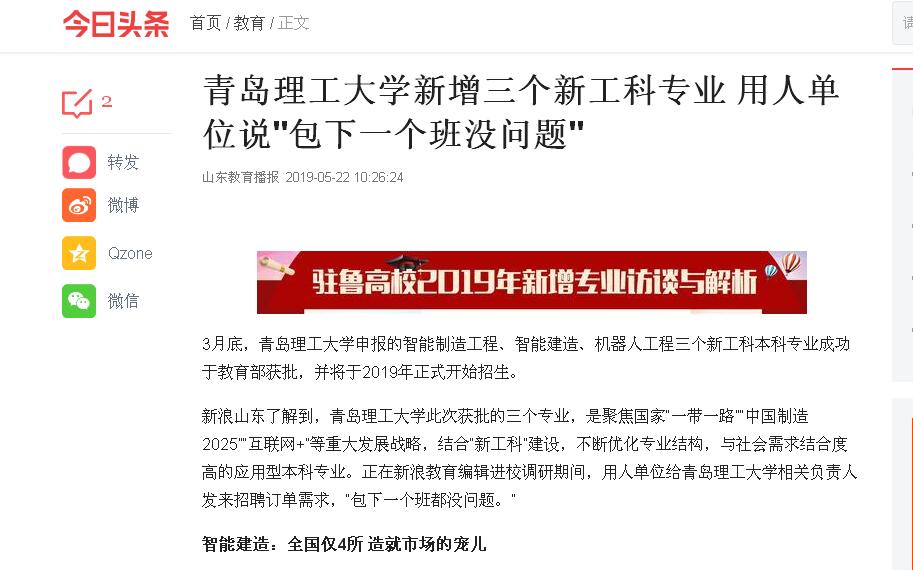 2019年新开设的“智能制造工程”专业,精准对接高端装备产业,完善智能制造产业体系。 “智能建造”专业,涉及学科多、跨度大,推动传统产业的智能化建设。“机器人工程”专业精准对接新一代信息技术产业,同时是适应新时期国家产业需求和国际发展趋势,对接山东半岛蓝色经济区域需求的大势所趋。