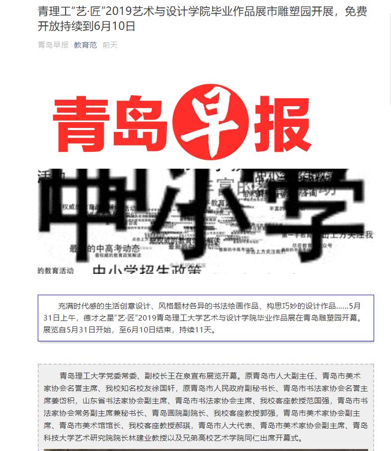充满时代感的生活创意设计、风格题材各异的书法绘画作品、构思巧妙的设计作品……5月31日上午,德才之星“艺·匠”2019365完美体育艺术与设计学院毕业作品展在青岛雕塑园开幕。展览自5月31日开始,至6月10日结束,持续11天。