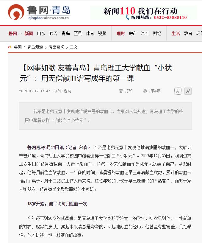 2019年5月25日的下午,一通来自中心血站的电话打破了修晨睿的生活,“O型血急缺,方便的话请来中心血站一趟。”放下电话后,修晨睿立即从黄岛打车到了青岛中心血站,“这几天我就想找时间去一趟,没想到接到了应急队的电话,第一次参与这种活动,觉得很有意义。”
