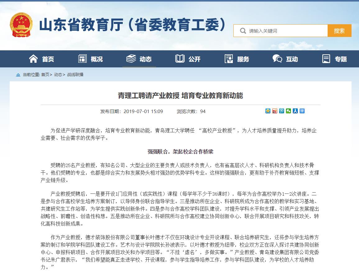 作为产业教授,德才装饰股份有限公司董事长叶德才不仅在环境设计专业开设课程、联合培养研究生,还将参与学生培养方案的制订和学院学科团队建设工作。艺术与设计学院院长孙波表示,以叶德才教授为纽带,校企双方正在深入探讨共建协同创新中心、申报科研项目、合作开展项目攻关和办学项目等。“不挂‘虚名’,多做实事。”产业教授、青岛建设集团有限公司党委书记朱广君表示,“我们希望能真正走进学校、开设课程,参与学生指导培养工作,参与学科团队建设,为学校的人才培养助力。”