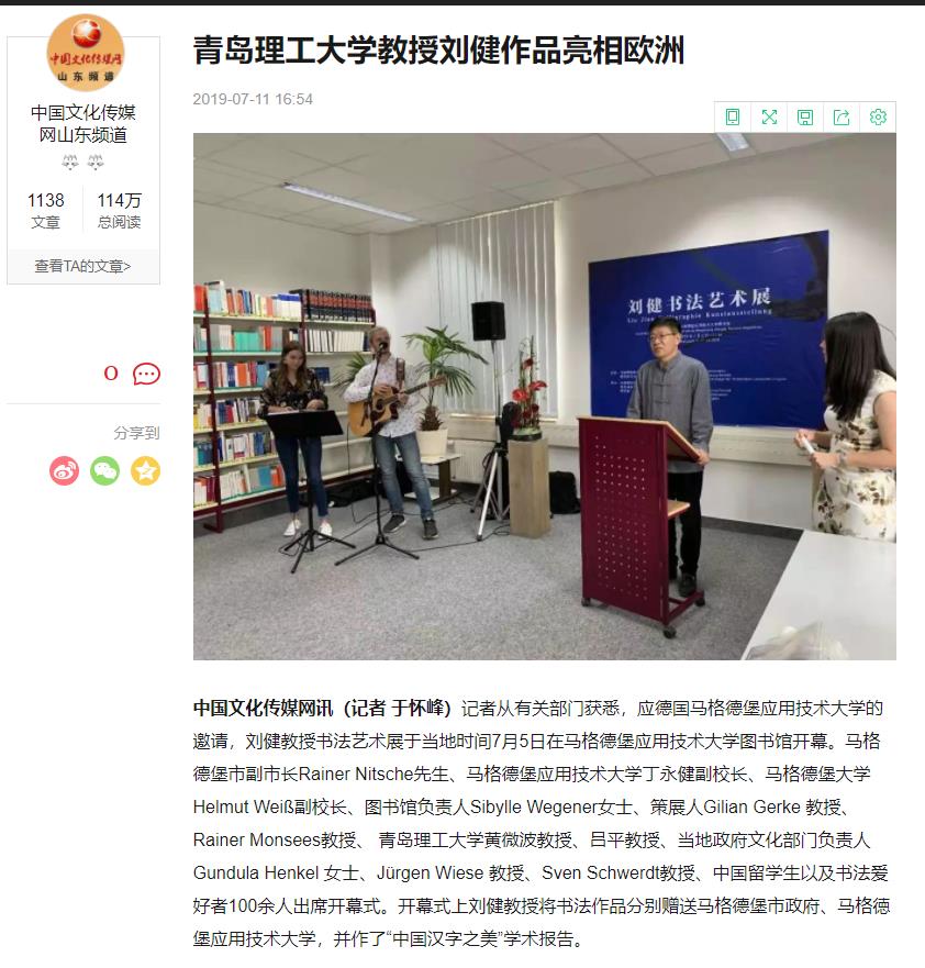 中国文化传媒网讯(记者 于怀峰)记者从有关部门获悉,应德国马格德堡应用技术大学的邀请,刘健教授书法艺术展于当地时间7月5日在马格德堡应用技术大学图书馆开幕。马格德堡市副市长Rainer Nitsche先生、马格德堡应用技术大学丁永健副校长、马格德堡大学Helmut Weiß副校长、图书馆负责人Sibylle Wegener女士、策展人Gilian Gerke 教授、Rainer Monsees教授、 365完美体育黄微波教授、吕平教授、当地政府文化部门负责人Gundula Henkel 女士、Jürgen Wiese 教授、Sven Schwerdt教授、中国留学生以及书法爱好者100余人出席开幕式。开幕式上刘健教授将书法作品分别赠送马格德堡市政府、马格徳堡应用技术大学,并作了“中国汉字之美”学术报告。