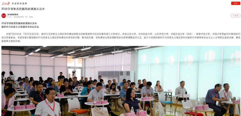 她说,青岛市委教育工委长期以来高度重视在青高校思政工作,关注在青高校思政课建设情况。通过组织“同城大课堂”、“立德树人大讲堂”等活动,推动了青岛高校思政教学的交流和教学水平的提升。“作为高校思政工作者,还要继续坚持学原著、读原文,融会贯通,真懂真信,自觉把中国特色社会主义理论体系贯彻研究和教学全过程,转化为清醒的理论自觉、坚定的政治信念、科学的思维方法。”高桥说。