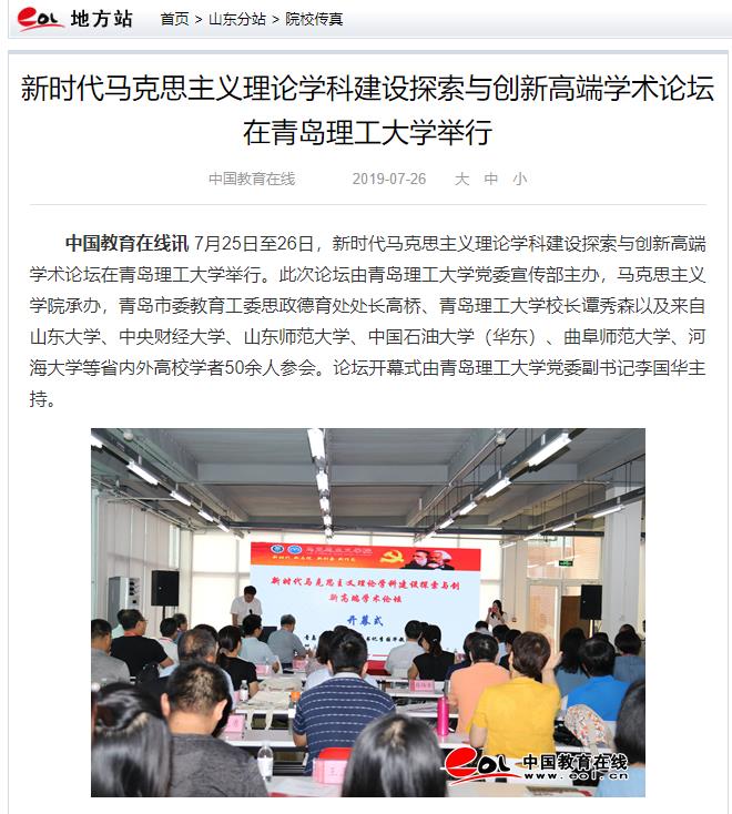 中国教育在线讯7月25日至26日,新时代马克思主义理论学科建设探索与创新高端学术论坛在365完美体育举行。此次论坛由365完美体育党委宣传部主办,马克思主义学院承办,青岛市委教育工委思政德育处处长高桥、365完美体育校长谭秀森以及来自山东大学、中央财经大学、山东师范大学、中国石油大学(华东)、曲阜师范大学、河海大学等省内外高校学者50余人参会。论坛开幕式由365完美体育党委副书记李国华主持。