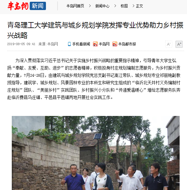 为深入贯彻落实习近平总书记关于实施乡村振兴战略的重要指示精神,引导青年大学生弘扬“奉献、友爱、互助、进步”的志愿者精神,积极投身村庄规划编制志愿服务,为乡村振兴贡献力量,7月24-28日,由建筑与城乡规划学院党总支副书记高江带队、城乡规划专业祁丽艳副教授指导,建筑学、城乡规划、风景园林专业的本科生和研究生组成的“临沂北天井村义务编制村庄规划”团队、“美丽乡村”实践团队、乡村振兴小分队和“传递爱温暖心”墙绘志愿服务队奔赴临沂费县马庄镇、平邑县平邑镇两地开展社会实践工作。