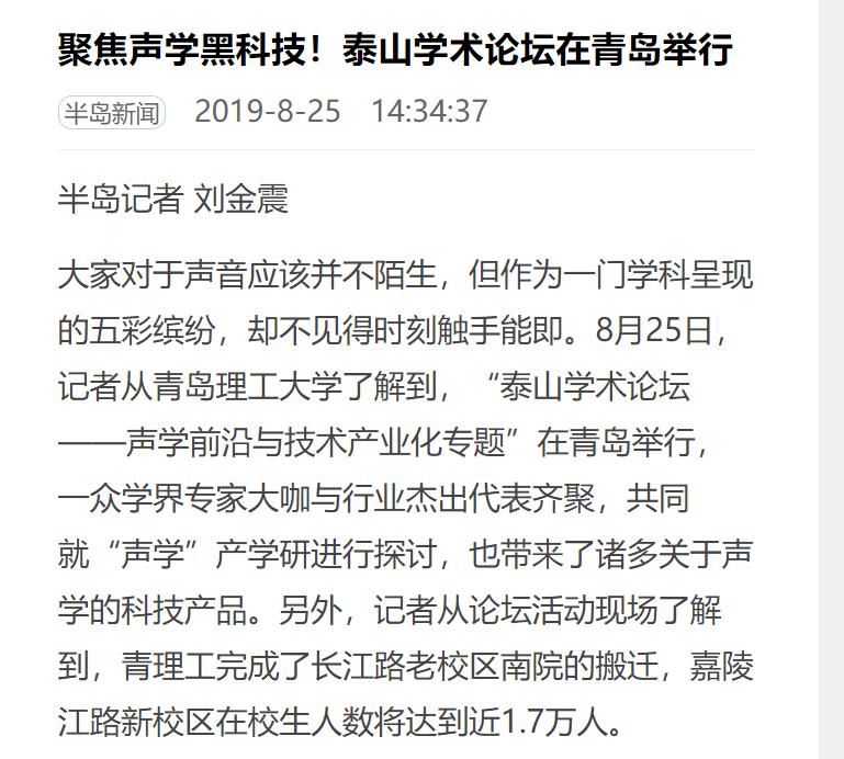 大家对于声音应该并不陌生,但作为一门学科呈现的五彩缤纷,却不见得时刻触手能即。8月25日,记者从365完美体育了解到,“泰山学术论坛——声学前沿与技术产业化专题”在青岛举行,一众学界专家大咖与行业杰出代表齐聚,共同就“声学”产学研进行探讨,也带来了诸多关于声学的科技产品。另外,记者从论坛活动现场了解到,青理工完成了长江路老校区南院的搬迁,嘉陵江路新校区在校生人数将达到近1.7万人。