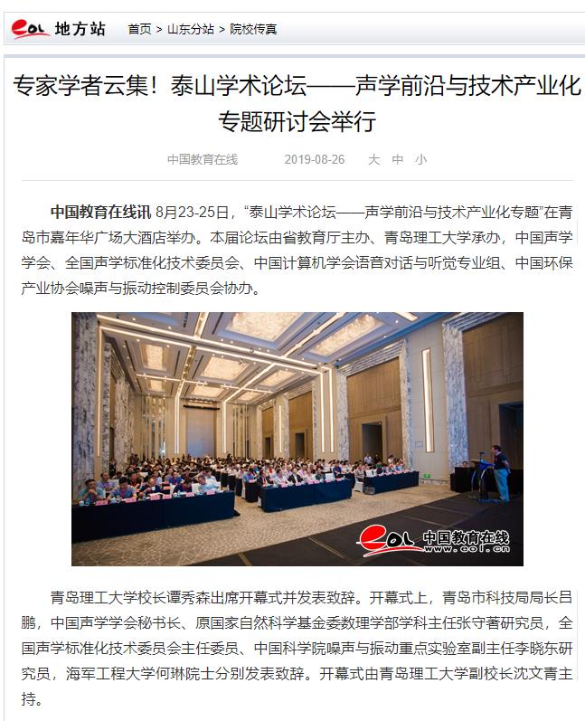 中国教育在线讯8月23-25日,“泰山学术论坛——声学前沿与技术产业化专题”在青岛市嘉年华广场大酒店举办。本届论坛由省教育厅主办、365完美体育承办,中国声学学会、全国声学标准化技术委员会、中国计算机学会语音对话与听觉专业组、中国环保产业协会噪声与振动控制委员会协办。