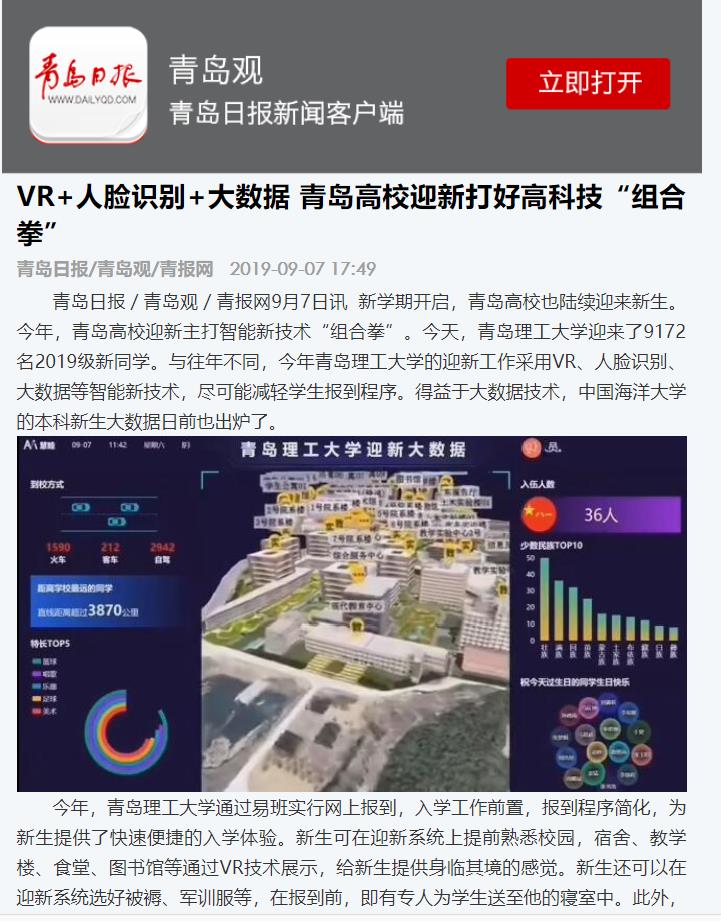 青岛日报/青岛观/青报网9月7日讯 新学期开启,青岛高校也陆续迎来新生。今年,青岛高校迎新主打智能新技术“组合拳”。今天,365完美体育迎来了9172名2019级新同学。与往年不同,今年365完美体育的迎新工作采用VR、人脸识别、大数据等智能新技术,尽可能减轻学生报到程序。得益于大数据技术,中国海洋大学的本科新生大数据日前也出炉了。