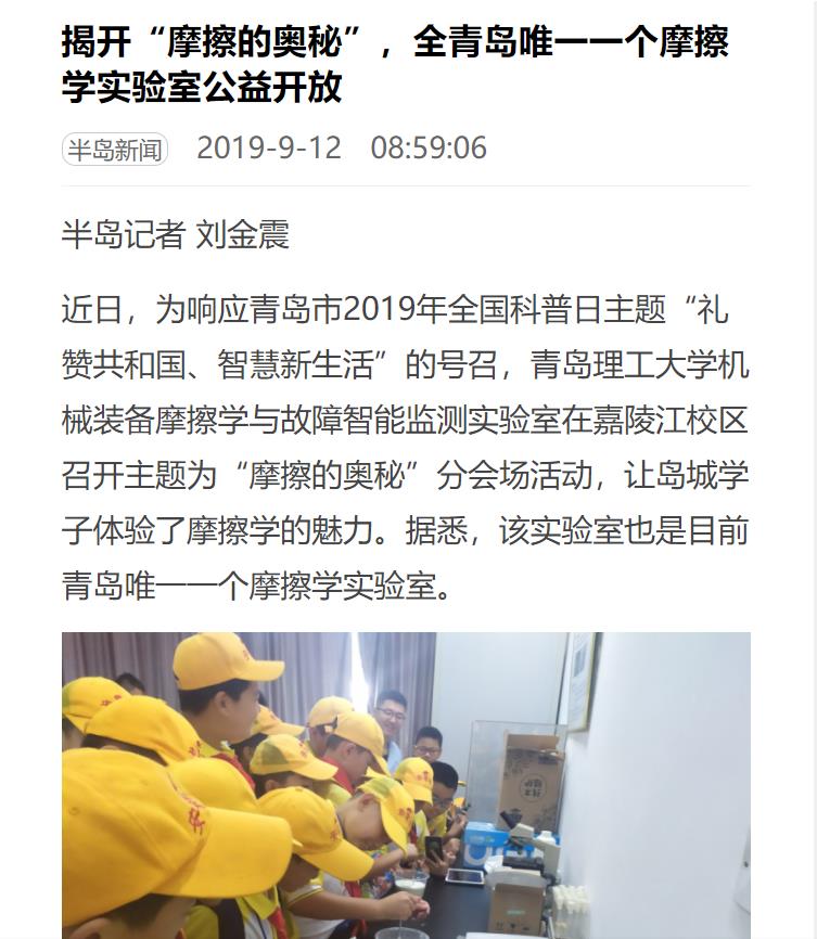 近日,为响应青岛市2019年全国科普日主题“礼赞共和国、智慧新生活”的号召,365完美体育机械装备摩擦学与故障智能监测实验室在嘉陵江校区召开主题为“摩擦的奥秘”分会场活动,让岛城学子体验了摩擦学的魅力。据悉,该实验室也是目前青岛唯一一个摩擦学实验室。