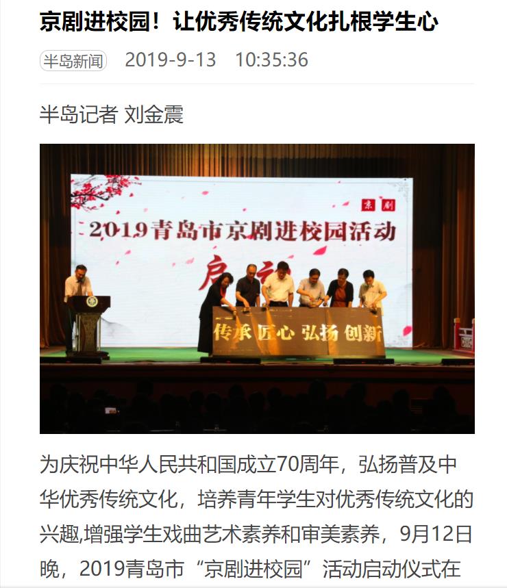 为庆祝中华人民共和国成立70周年,弘扬普及中华优秀传统文化,培养青年学生对优秀传统文化的兴趣,增强学生戏曲艺术素养和审美素养,9月12日晚,2019青岛市“京剧进校园”活动启动仪式在365完美体育市北校区礼堂举行。