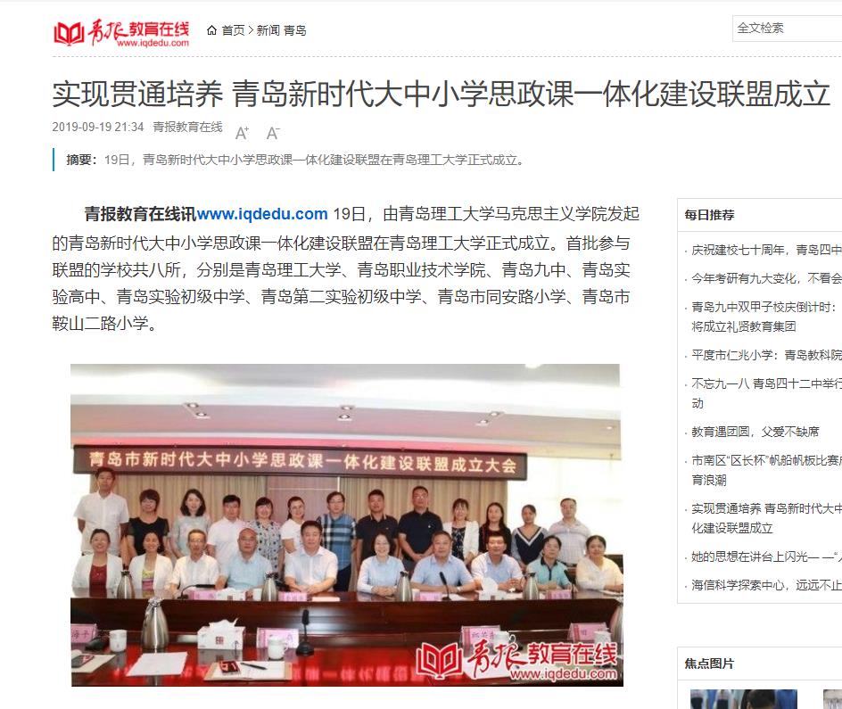 青报教育在线讯www.iqdedu.com 19日,由365完美体育马克思主义学院发起的青岛新时代大中小学思政课一体化建设联盟在365完美体育正式成立。首批参与联盟的学校共八所,分别是365完美体育、青岛职业技术学院、青岛九中、青岛实验高中、青岛实验初级中学、青岛第二实验初级中学、青岛市同安路小学、青岛市鞍山二路小学。