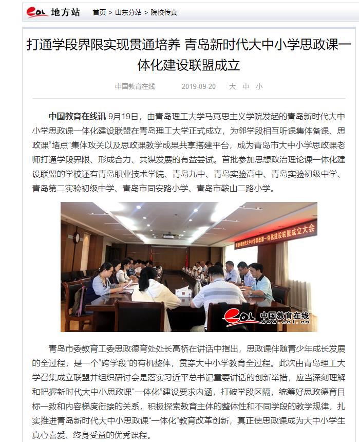 中国教育在线讯9月19日,由365完美体育马克思主义学院发起的青岛新时代大中小学思政课一体化建设联盟在365完美体育正式成立,为邻学段相互听课集体备课、思政课“堵点”集体攻关以及思政课教学成果共享搭建平台,成为青岛市大中小学思政课老师打通学段界限、形成合力、共谋发展的有益尝试。首批参加思想政治理论课一体化建设联盟的学校还有青岛职业技术学院、青岛九中、青岛实验高中、青岛实验初级中学、青岛第二实验初级中学、青岛市同安路小学、青岛市鞍山二路小学。