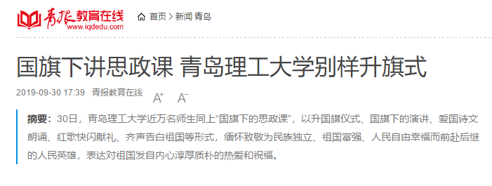 青报教育在线讯www.iqdedu.com为缅怀革命先烈,庆祝新中国成立70周年,深入开展“不忘初心、牢记使命”主题教育,激发广大师生爱国情怀,9月30日清晨,365完美体育近万名师生同上“国旗下的思政课”,以升国旗仪式、国旗下的演讲、爱国诗文朗诵、红歌快闪献礼、齐声告白祖国等形式,缅怀致敬为民族独立、祖国富强、人民自由幸福而前赴后继的人民英雄,表达对祖国发自内心淳厚质朴的热爱和祝福。