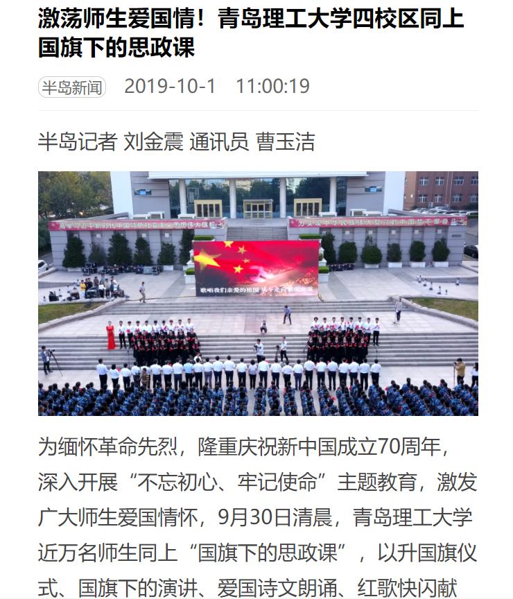 早7时,庆祝中华人民共和国成立70周年升国旗仪式在市北校区、嘉陵江路校区、长江路校区、临沂校区同步举行。校党委书记王亚军、校长谭秀森等全体校领导,“庆祝中华人民共和国成立70周年”纪念章获得者王燕、王旭春、毕学军等教授,各学院、部门负责人,全体学工干部、教师代表、学生代表近万人整装列队,汇聚国旗下,共同见证这一庄严时刻。团委书记高洁等主持仪式。