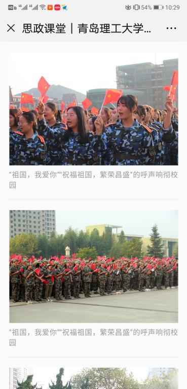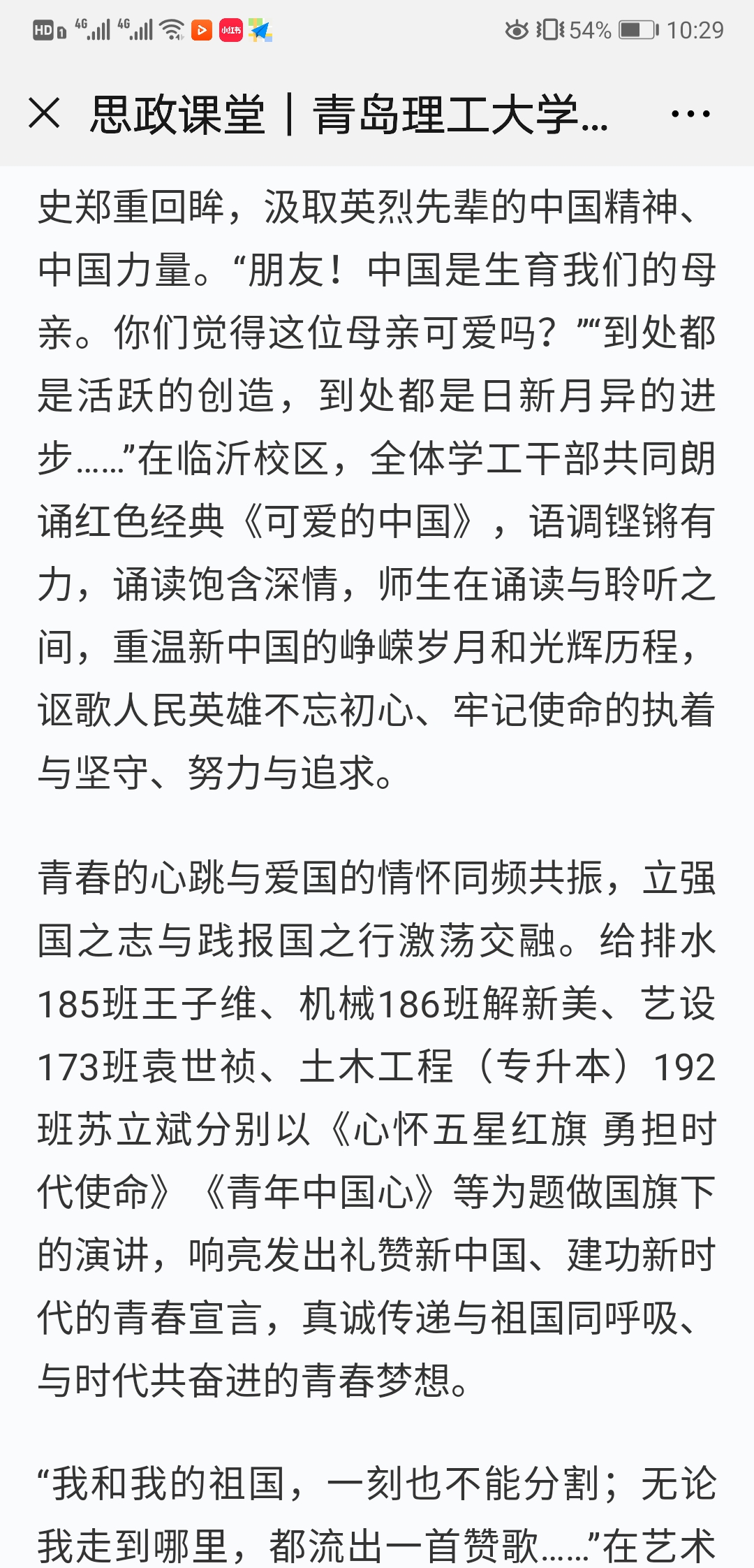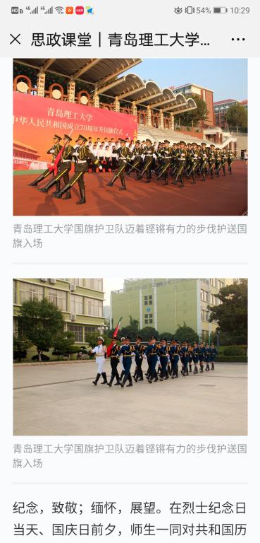 纪念,致敬;缅怀,展望。在烈士纪念日当天、国庆日前夕,师生一同对共和国历史郑重回眸,汲取英烈先辈的中国精神、中国力量。“朋友!中国是生育我们的母亲。你们觉得这位母亲可爱吗?”“到处都是活跃的创造,到处都是日新月异的进步……”在临沂校区,全体学工干部共同朗诵红色经典《可爱的中国》,语调铿锵有力,诵读饱含深情,师生在诵读与聆听之间,重温新中国的峥嵘岁月和光辉历程,讴歌人民英雄不忘初心、牢记使命的执着与坚守、努力与追求。