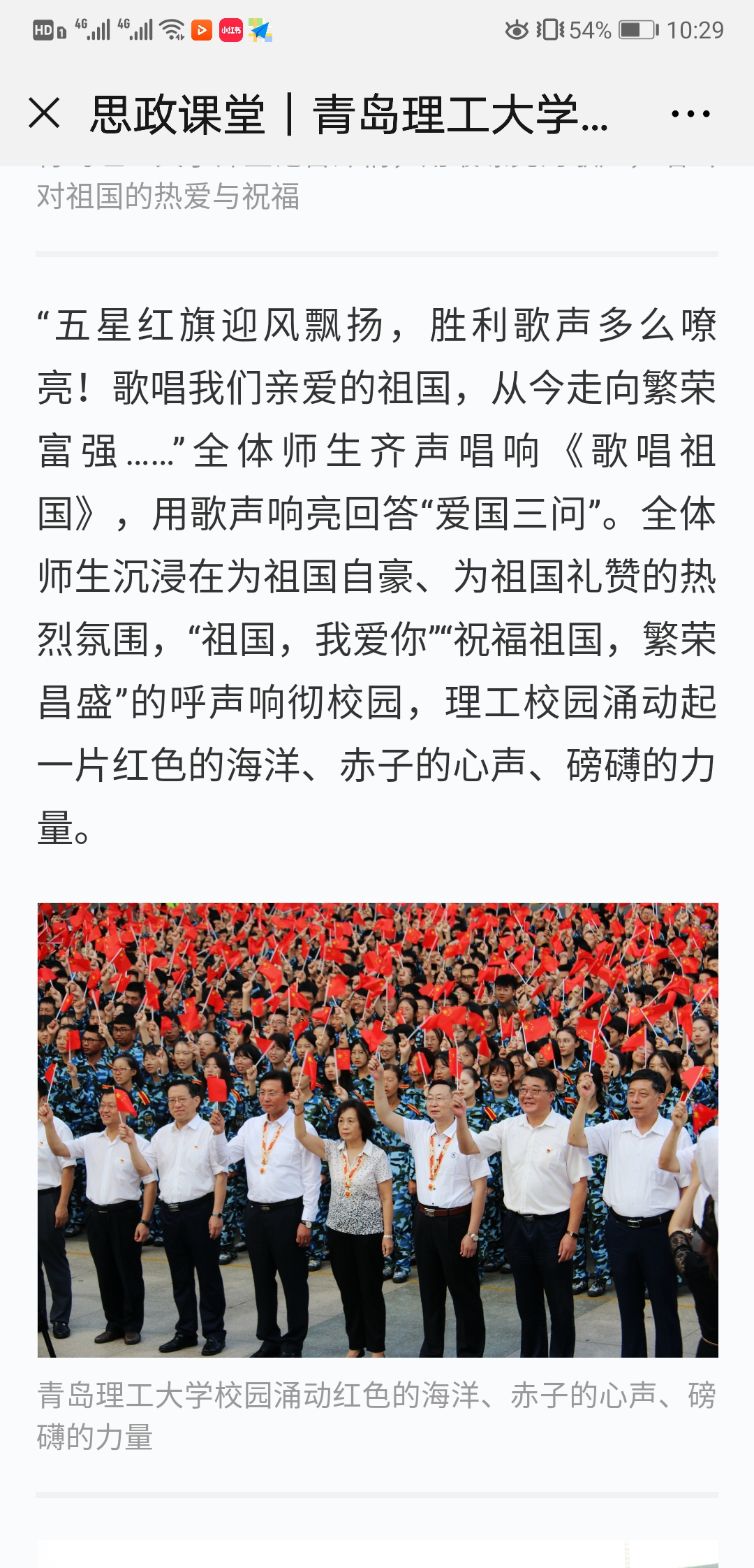 “五星红旗迎风飘扬,胜利歌声多么嘹亮!歌唱我们亲爱的祖国,从今走向繁荣富强……”全体师生齐声唱响《歌唱祖国》,用歌声响亮回答“爱国三问”。全体师生沉浸在为祖国自豪、为祖国礼赞的热烈氛围,“祖国,我爱你”“祝福祖国,繁荣昌盛”的呼声响彻校园,理工校园涌动起一片红色的海洋、赤子的心声、磅礴的力量。