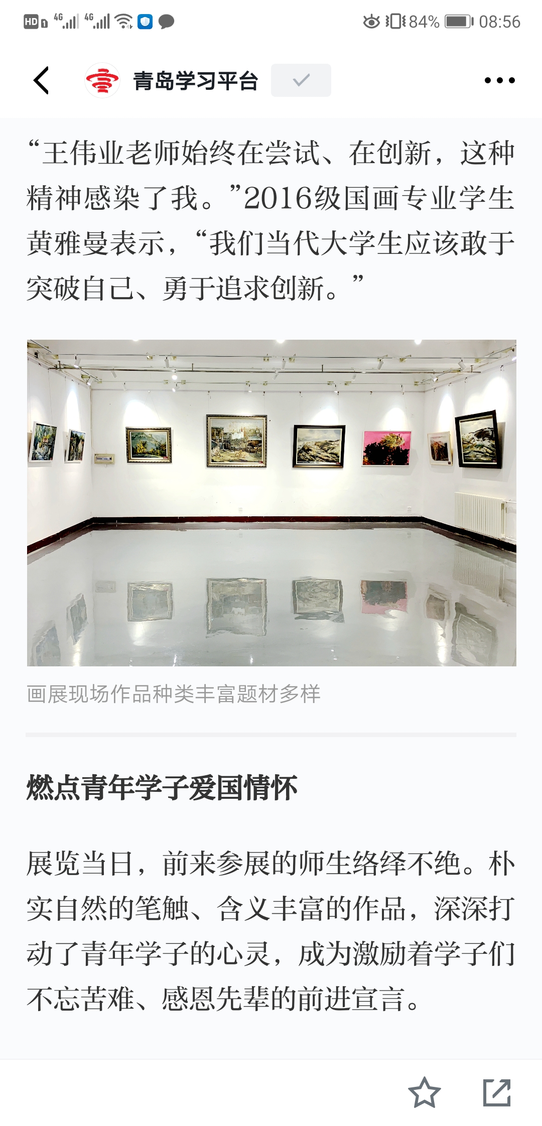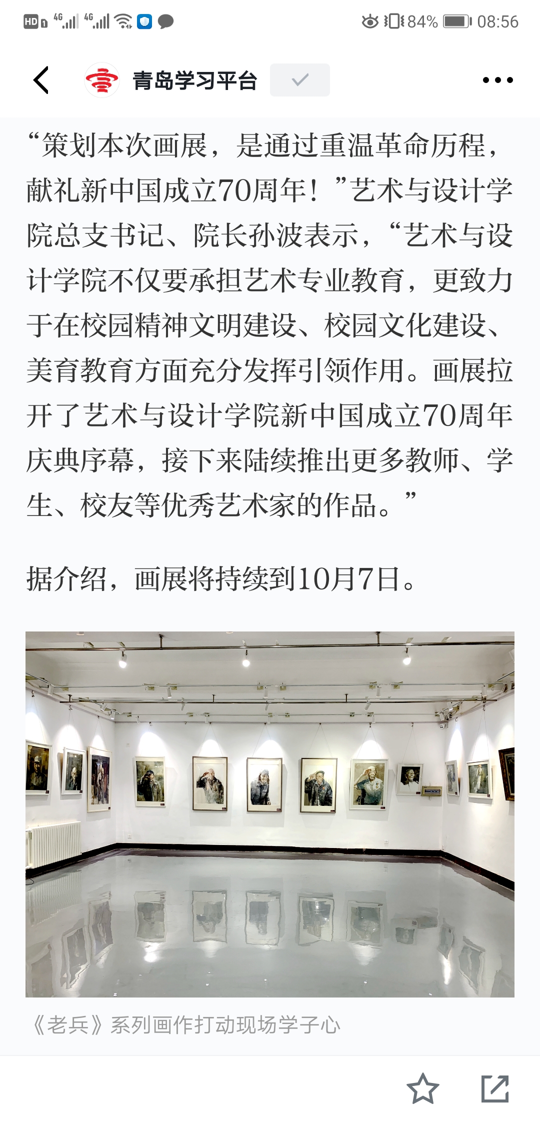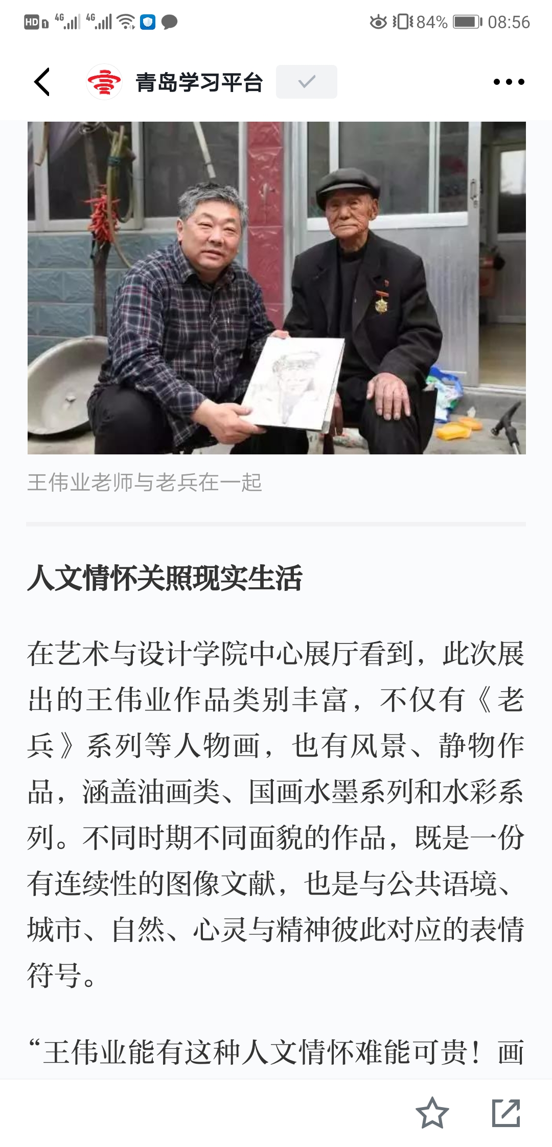 油画161班学生李朝霞表示,王老师的画展表达了老兵背后的故事,老兵在战争中抛头颅、洒热血,为国奋战、不惜牺牲,我们应该向老兵致敬!鲜活的人生故事和亲切的生命体验,能够赋予一件作品灵魂。“我们要向老师学习,把自己的创作赋予人文关怀和精神内涵,不忘初心、牢记使命,砥砺前行!”