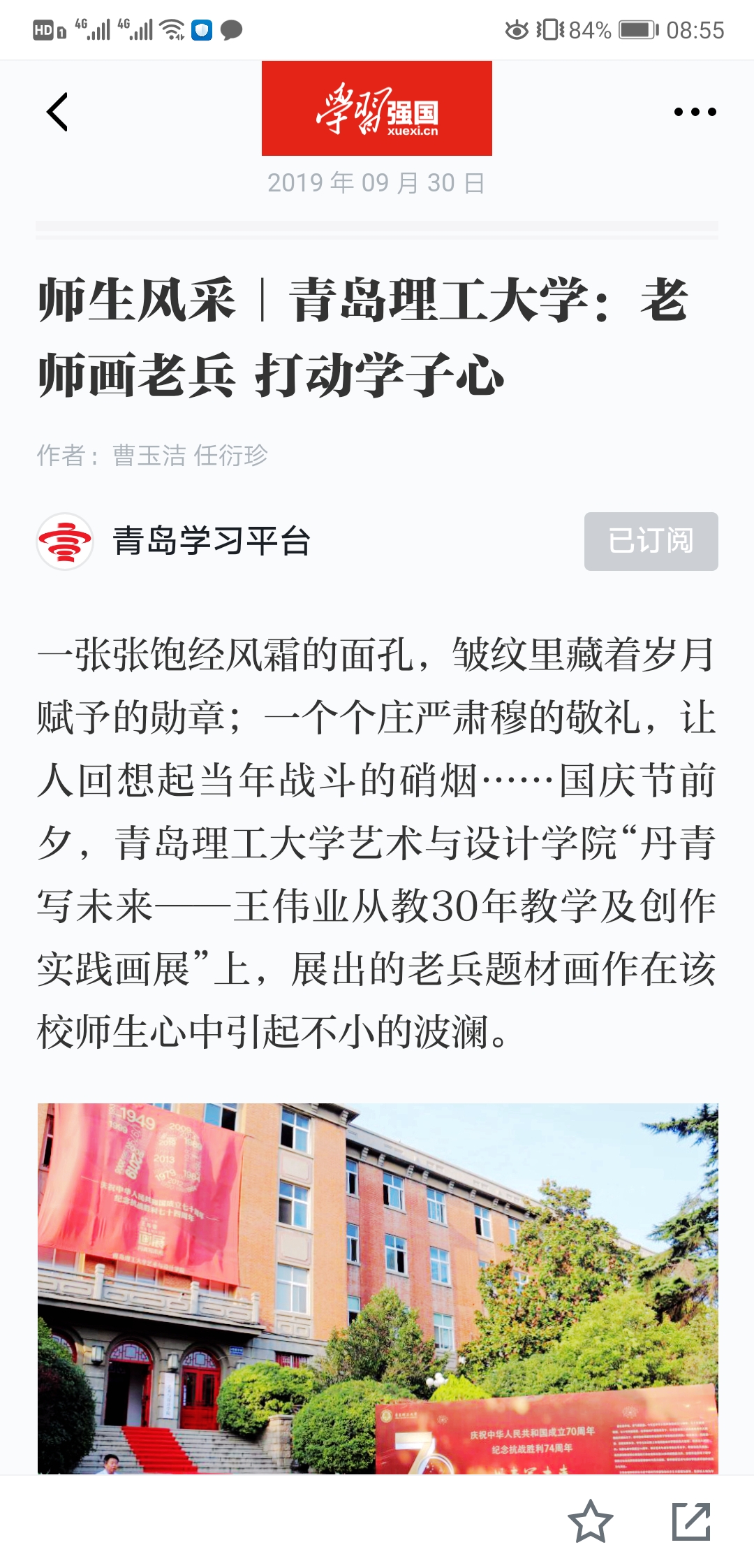 一张张饱经风霜的面孔,皱纹里藏着岁月赋予的勋章;一个个庄严肃穆的敬礼,让人回想起当年战斗的硝烟……国庆节前夕,365完美体育艺术与设计学院“丹青写未来——王伟业从教30年教学及创作实践画展”上,展出的老兵题材画作在该校师生心中引起不小的波澜。