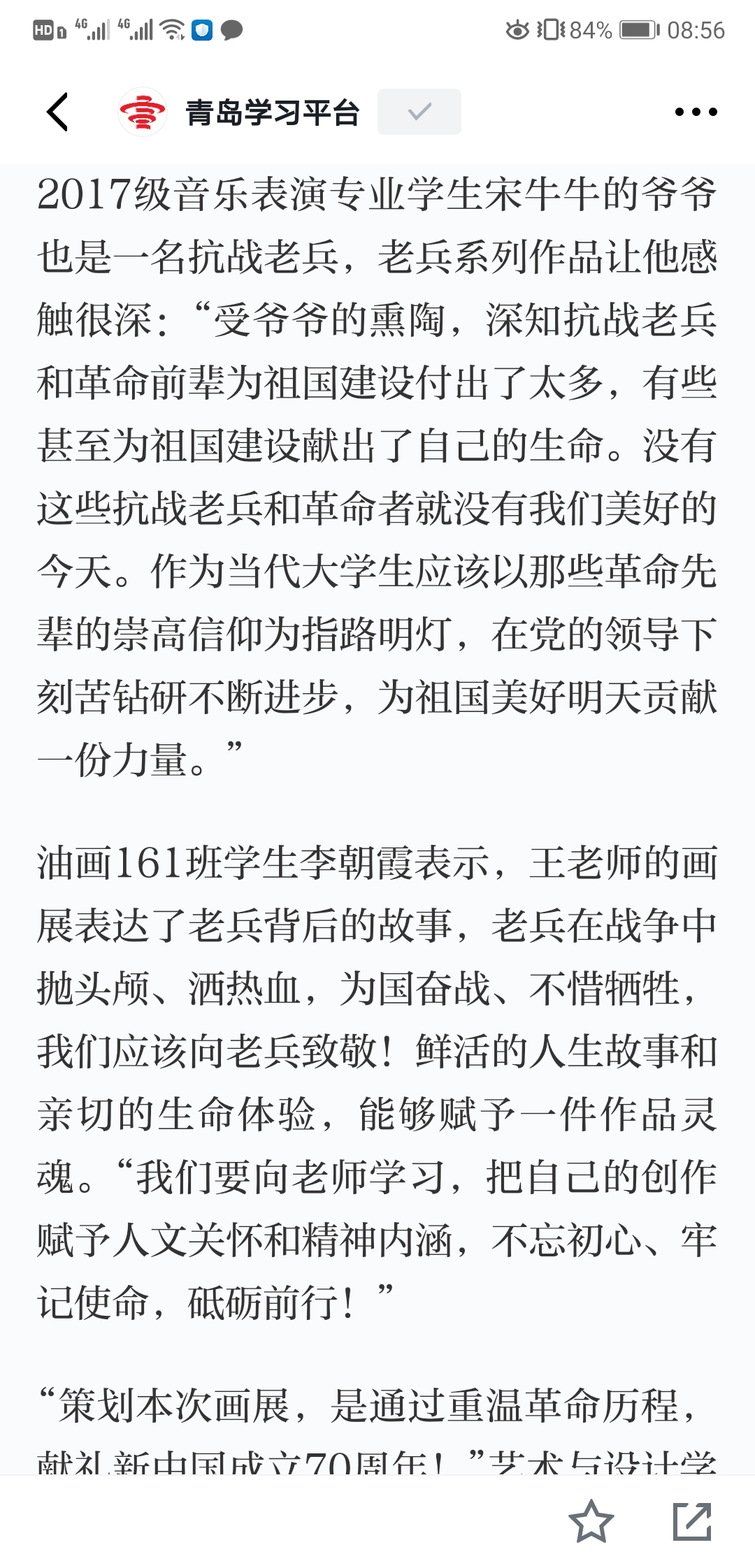 2017级音乐表演专业学生宋牛牛的爷爷也是一名抗战老兵,老兵系列作品让他感触很深:“受爷爷的熏陶,深知抗战老兵和革命前辈为祖国建设付出了太多,有些甚至为祖国建设献出了自己的生命。没有这些抗战老兵和革命者就没有我们美好的今天。作为当代大学生应该以那些革命先辈的崇高信仰为指路明灯,在党的领导下刻苦钻研不断进步,为祖国美好明天贡献一份力量。”