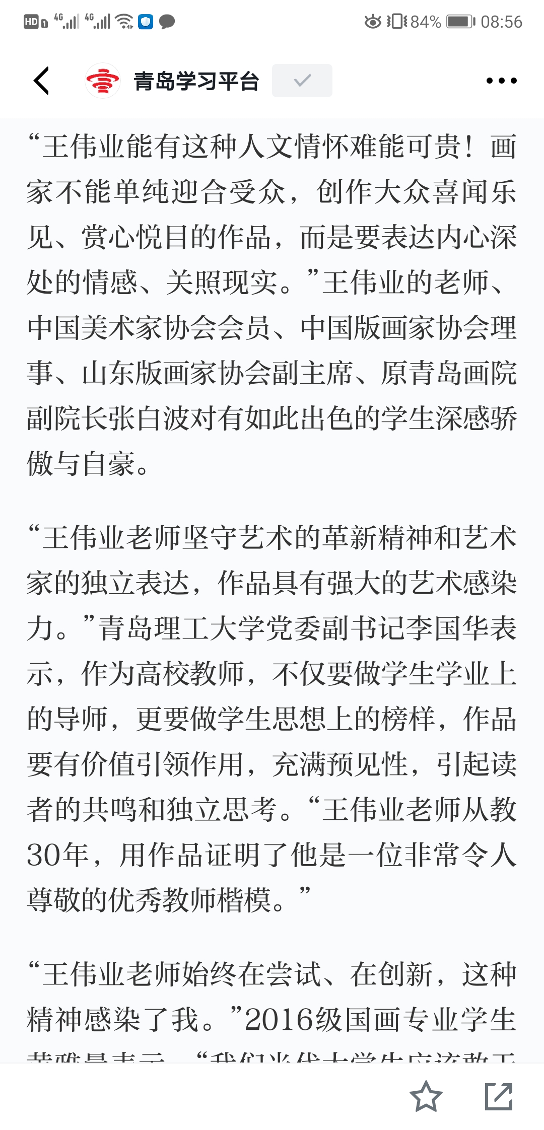 “王伟业能有这种人文情怀难能可贵!画家不能单纯迎合受众,创作大众喜闻乐见、赏心悦目的作品,而是要表达内心深处的情感、关照现实。”王伟业的老师、中国美术家协会会员、中国版画家协会理事、山东版画家协会副主席、原青岛画院副院长张白波对有如此出色的学生深感骄傲与自豪。