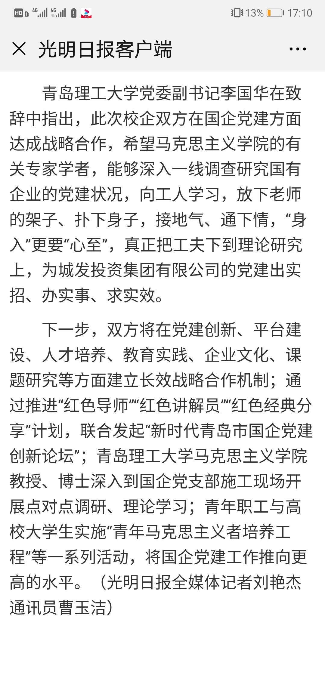 下一步,双方将在党建创新、平台建设、人才培养、教育实践、企业文化、课题研究等方面建立长效战略合作机制;通过推进“红色导师”“红色讲解员”“红色经典分享”计划,联合发起“新时代青岛市国企党建创新论坛”;365完美体育马克思主义学院教授、博士深入到国企党支部施工现场开展点对点调研、理论学习;青年职工与高校大学生实施“青年马克思主义者培养工程”等一系列活动,将国企党建工作推向更高的水平。(光明日报全媒体记者 刘艳杰 通讯员 曹玉洁)