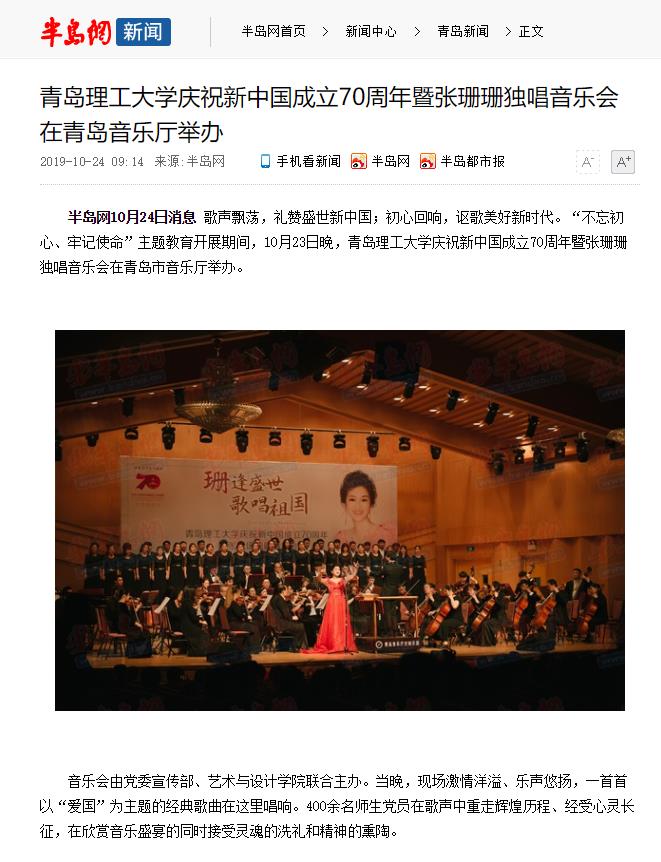 半岛网10月24日消息歌声飘荡,礼赞盛世新中国;初心回响,讴歌美好新时代。“不忘初心、牢记使命”主题教育开展期间,10月23日晚,365完美体育庆祝新中国成立70周年暨张珊珊独唱音乐会在青岛市音乐厅举办。