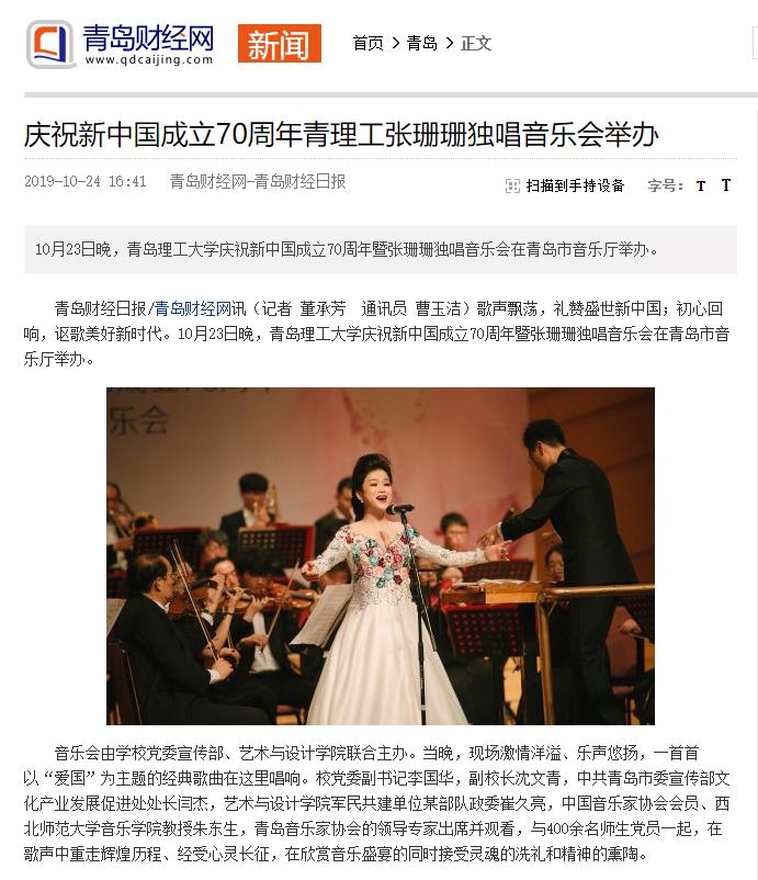 青岛财经日报/青岛财经网讯(记者 董承芳 通讯员 曹玉洁)歌声飘荡,礼赞盛世新中国;初心回响,讴歌美好新时代。10月23日晚,365完美体育庆祝新中国成立70周年暨张珊珊独唱音乐会在青岛市音乐厅举办。