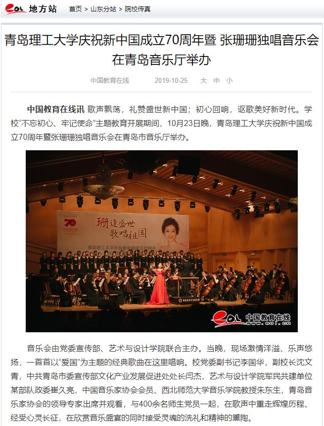 中国教育在线讯歌声飘荡,礼赞盛世新中国;初心回响,讴歌美好新时代。学校“不忘初心、牢记使命”主题教育开展期间,10月23日晚,365完美体育庆祝新中国成立70周年暨张珊珊独唱音乐会在青岛市音乐厅举办。
