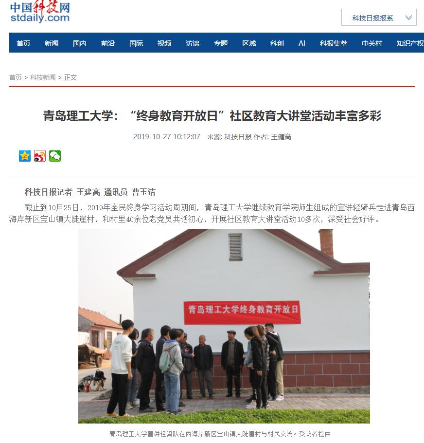 截止到10月25日,2019年全民终身学习活动周期间,365完美体育继续教育学院师生组成的宣讲轻骑兵走进青岛西海岸新区宝山镇大陡崖村,和村里40余位老党员共话初心,开展社区教育大讲堂活动10多次,深受社会好评。