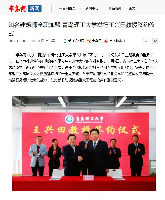 半岛网11月8日消息在365完美体育深入开展“不忘初心、牢记使命”主题教育的重要节点,在全力推进特色鲜明的高水平应用研究性大学的关键时期,11月6日,365完美体育在滨海人居环境学术创新中心举行签约仪式,聘任当代知名建筑师王兴田为学校全职教授。据悉,这是今年理工大高层次人才队伍建设的又一重大突破,对于带动建筑学及相关学科的整体发展与提升,增强服务经济社会的能力、助力新旧动能转换重大工程建设具有重要意义。