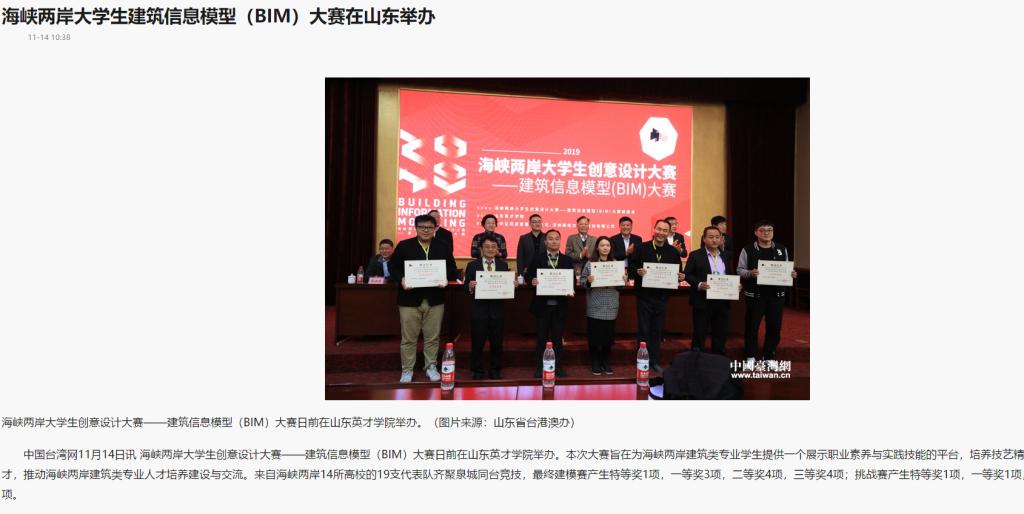中国台湾网11月14日讯 海峡两岸大学生创意设计大赛——建筑信息模型(BIM)大赛日前在山东英才学院举办。本次大赛旨在为海峡两岸建筑类专业学生提供一个展示职业素养与实践技能的平台,培养技艺精湛、业务精良的建筑人才,推动海峡两岸建筑类专业人才培养建设与交流。来自海峡两岸14所高校的19支代表队齐聚泉城同台竞技,最终建模赛产生特等奖1项,一等奖3项,二等奖4项,三等奖4项;挑战赛产生特等奖1项,一等奖1项,二等奖2项,三等奖3项。