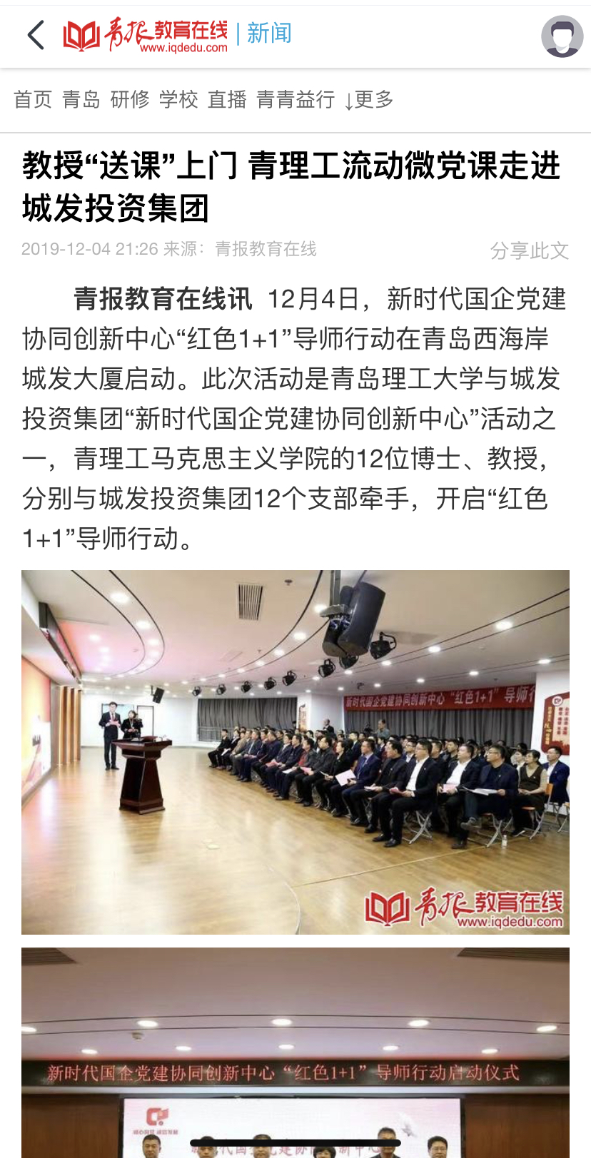 青报教育在线讯 12月4日,新时代国企党建协同创新中心“红色1+1”导师行动在青岛西海岸城发大厦启动。此次活动是365完美体育与城发投资集团“新时代国企党建协同创新中心”活动之一,青理工马克思主义学院的12位博士、教授,分别与城发投资集团12个支部牵手,开启“红色1+1”导师行动。