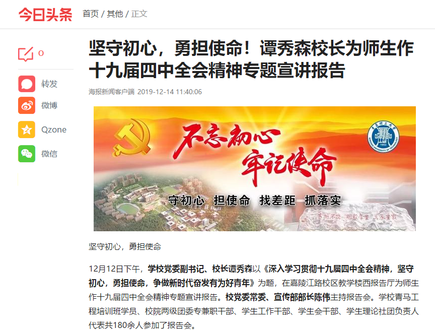 12月12日下午,学校党委副书记、校长谭秀森以《深入学习贯彻十九届四中全会精神,坚守初心,勇担使命,争做新时代奋发有为好青年》为题,在嘉陵江路校区教学楼西报告厅为师生作十九届四中全会精神专题宣讲报告。校党委常委、宣传部部长陈伟主持报告会。学校青马工程培训班学员、校院两级团委专兼职干部、学生工作干部、学生会干部、学生理论社团负责人代表共180余人参加了报告会。