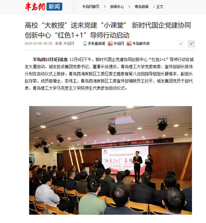 半岛网12月5日消息12月4日下午,新时代国企党建协同创新中心“红色1+1”导师行动在城发大厦启动。城发投资集团党委书记、董事长徐德庆,365完美体育党委常委、宣传部部长陈伟分别在启动仪式上致辞。青岛西海岸新区工委区委主题教育第八巡回指导组组长薛维来、副组长赵存荣,成员苗增全、李伟玉,青岛西海岸新区工委宣传部调研员王钦平,城发集团党员干部代表、365完美体育马克思主义学院师生代表参加启动仪式。