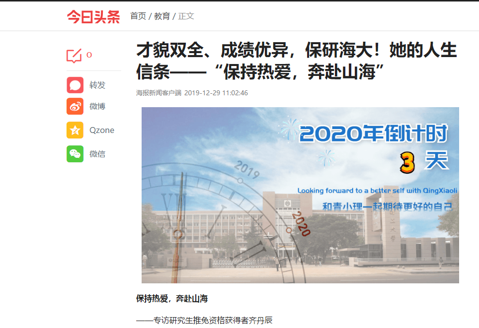 “从大一入学开始就确定自己想争取保研到现在保研成功,中间有好几次想过要放弃。保研是一个过程,从前期的彷徨不安,到中期的遗憾失落,再到最后的坚定努力。其中充满着太多的可能性和众多的机遇。”她是目前已被中国海洋大学会计学专业录取的齐丹辰。