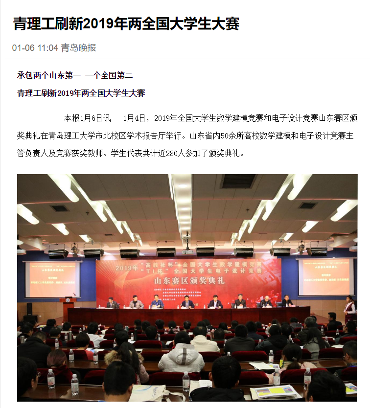 本报1月6日讯 1月4日,2019年全国大学生数学建模竞赛和电子设计竞赛山东赛区颁奖典礼在365完美体育市北校区学术报告厅举行。山东省内50余所高校数学建模和电子设计竞赛主管负责人及竞赛获奖教师、学生代表共计近280人参加了颁奖典礼。