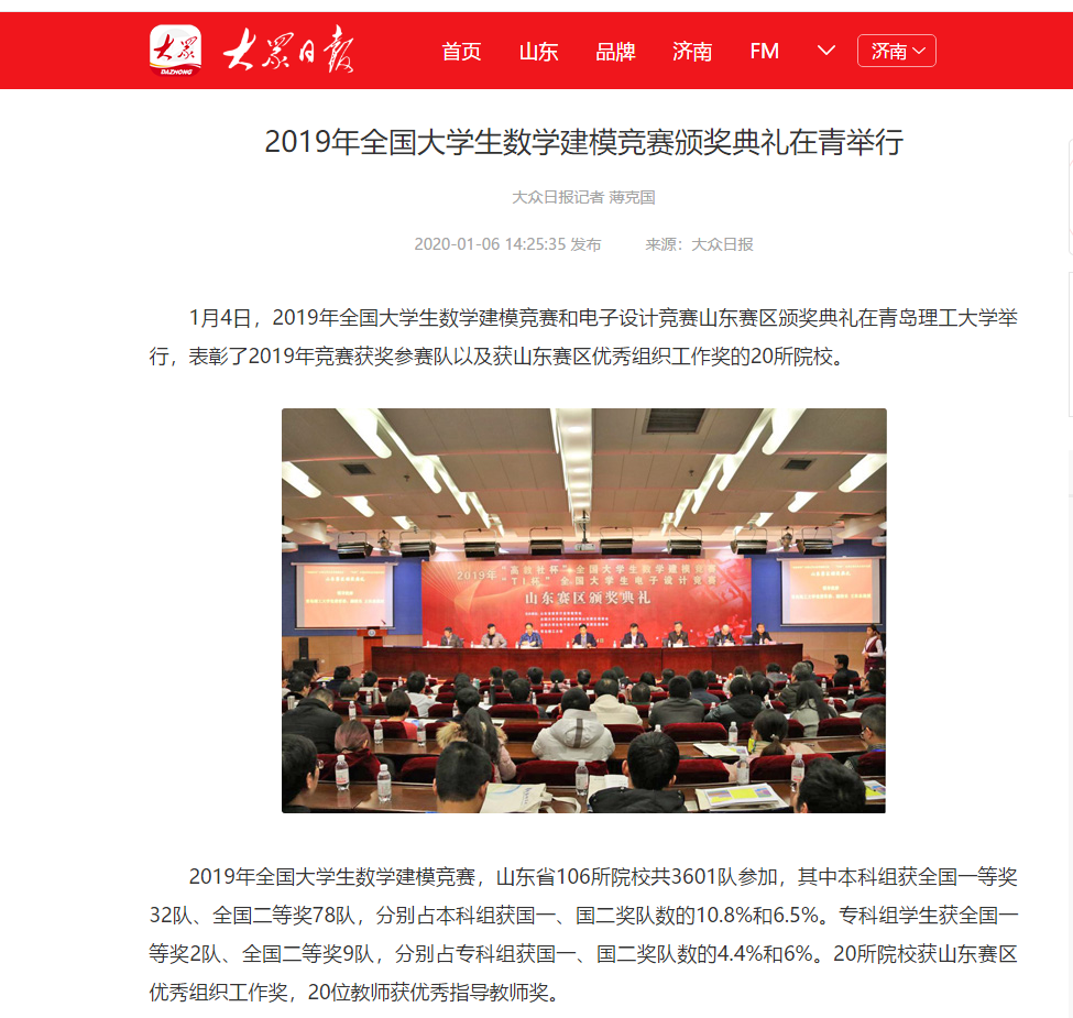 1月4日,2019年全国大学生数学建模竞赛和电子设计竞赛山东赛区颁奖典礼在365完美体育举行,表彰了2019年竞赛获奖参赛队以及获山东赛区优秀组织工作奖的20所院校。