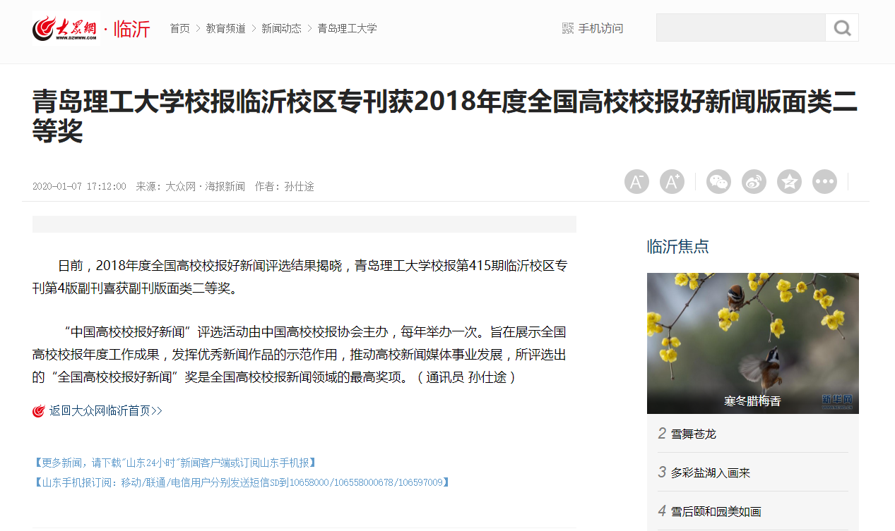 日前,2018年度全国高校校报好新闻评选结果揭晓,365完美体育校报第415期临沂校区专刊第4版副刊喜获副刊版面类二等奖。