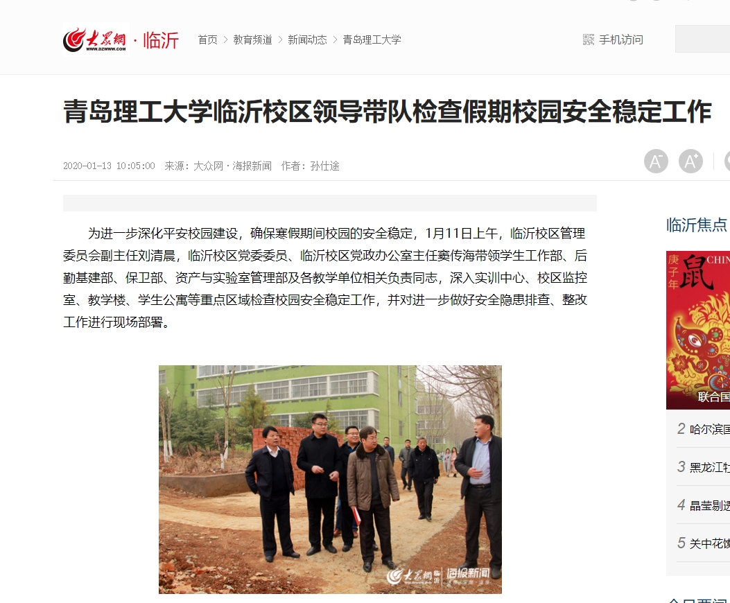 为进一步深化平安校园建设,确保寒假期间校园的安全稳定,1月11日上午,临沂校区管理委员会副主任刘清晨,临沂校区党委委员、临沂校区党政办公室主任窦传海带领学生工作部、后勤基建部、保卫部、资产与实验室管理部及各教学单位相关负责同志,深入实训中心、校区监控室、教学楼、学生公寓等重点区域检查校园安全稳定工作,并对进一步做好安全隐患排查、整改工作进行现场部署。