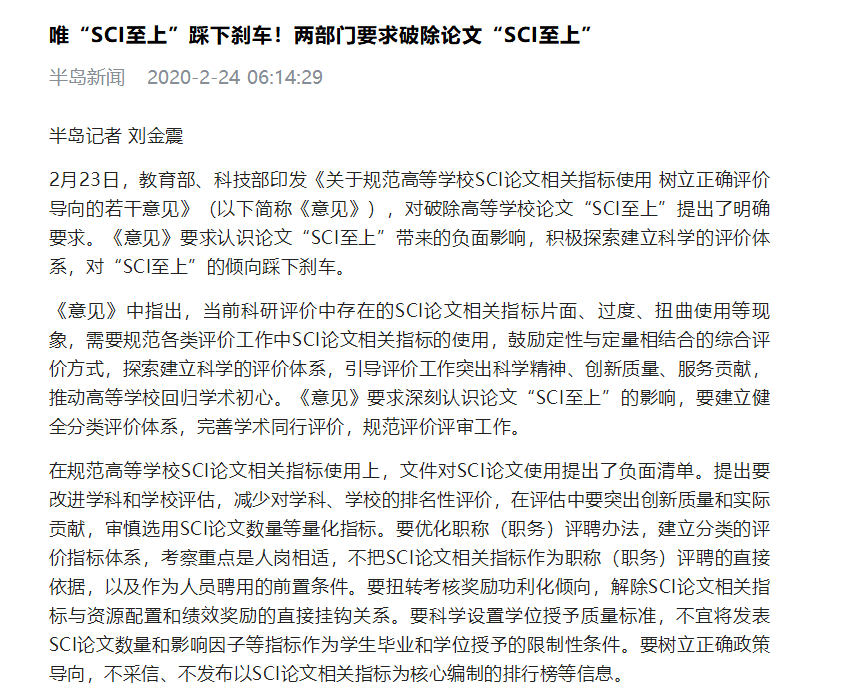 教育部、科技部印发《关于规范高等学校SCI论文相关指标使用 树立正确评价导向的若干意见》(以下简称《意见》),对破除高等学校论文“SCI至上”提出了明确要求。《意见》要求认识论文“SCI至上”带来的负面影响,积极探索建立科学的评价体系,对“SCI至上”的倾向踩下刹车。